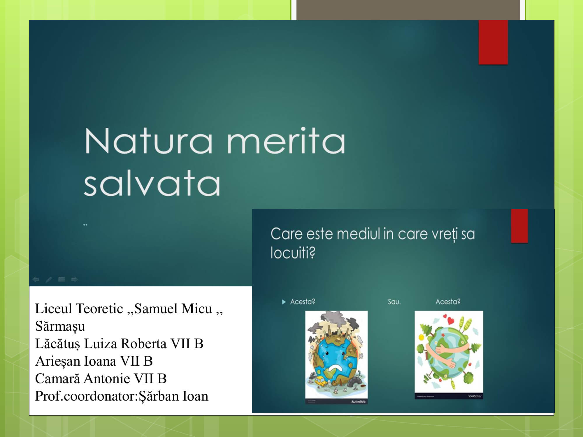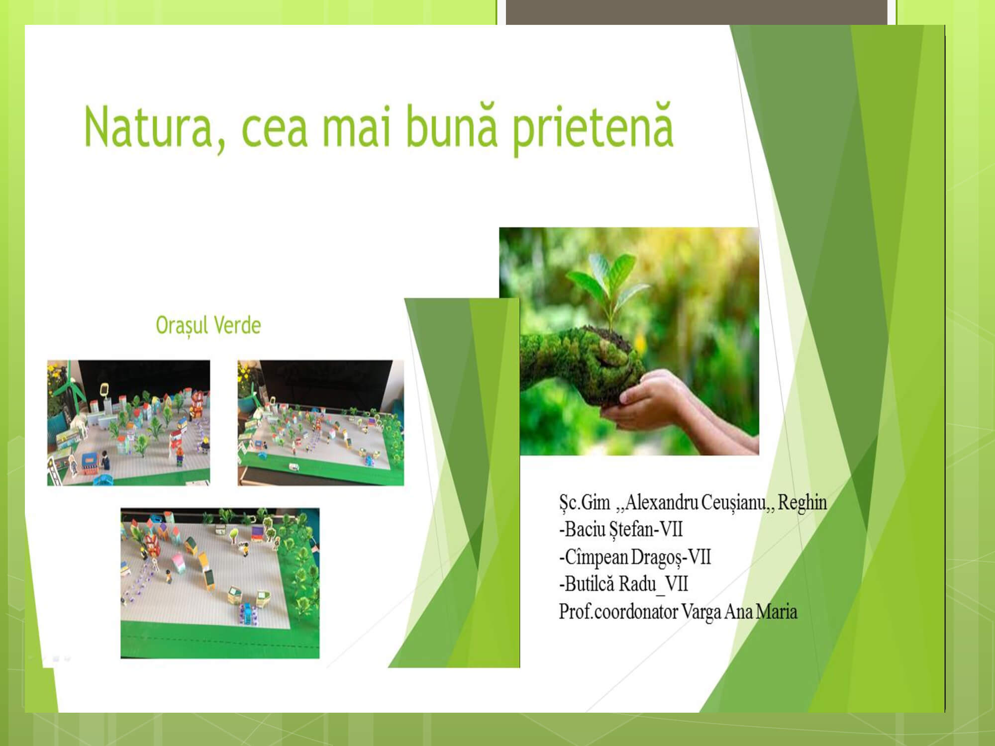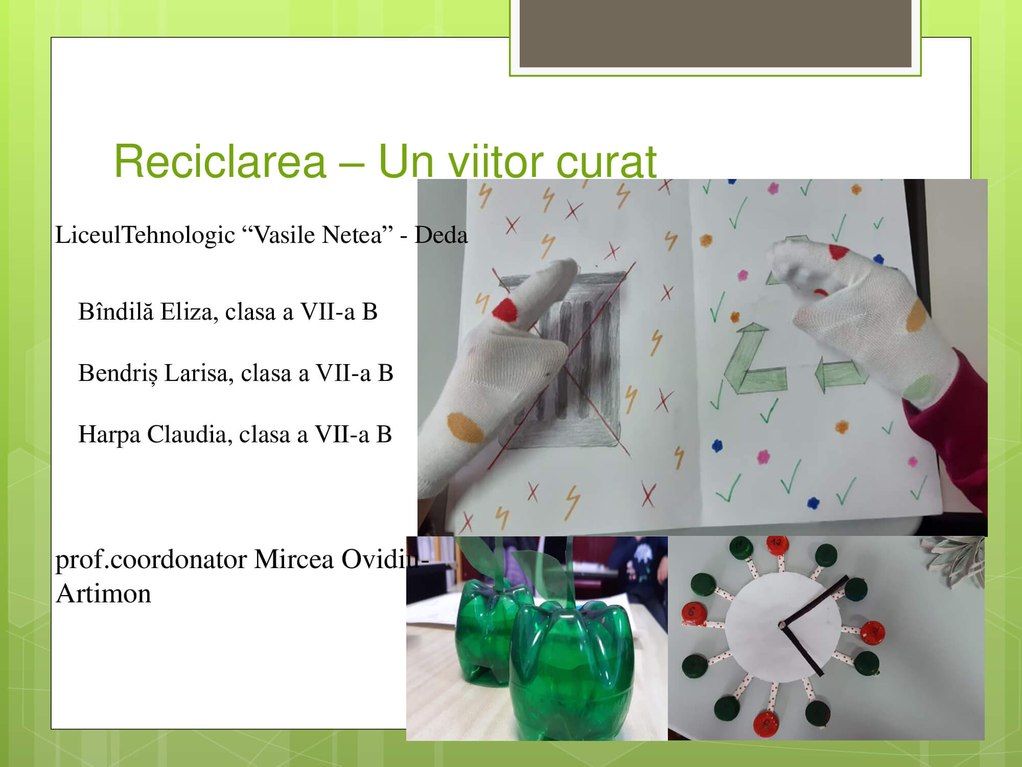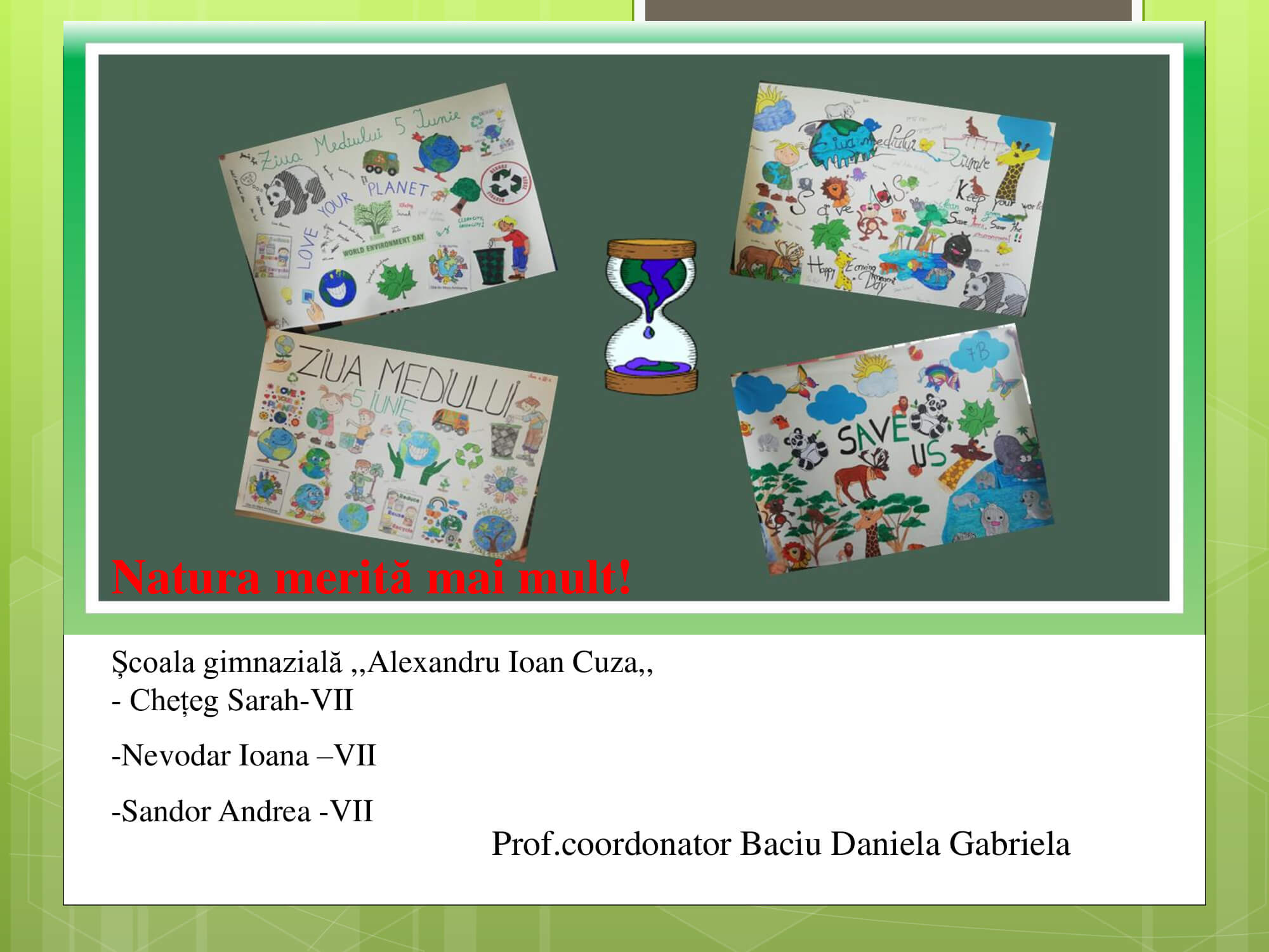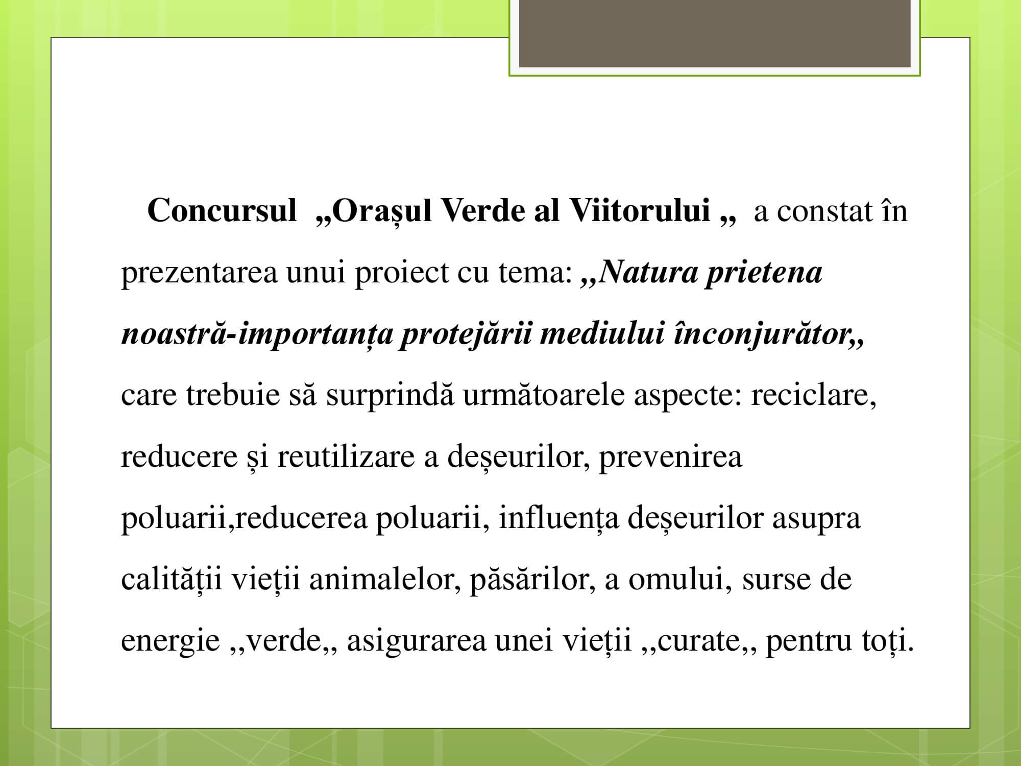 Concursul a constat în prezentarea unui proiect cu teme: „Natura prietena noastră-importanța protejării mediului înconjurător” care trebuie să surprindă următoarele aspecte: reciclare, reducere și reutilizare a deșeurilor, prevenirea poluării, reducerea poluării, influența deșeurilor asupra calității vieții animalelor, păsărilor, a omului, surse de energie „verde”, asigurarea unei vieți „curate” pentru toți.