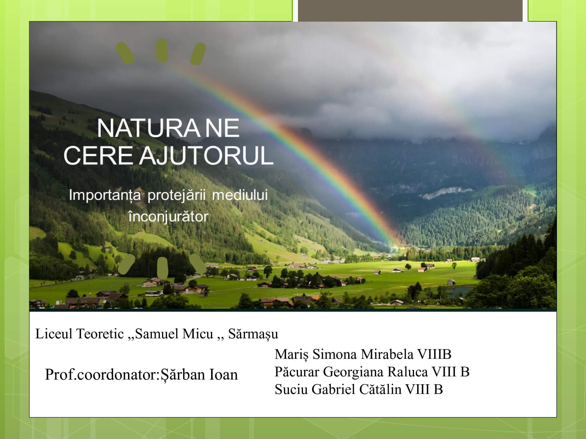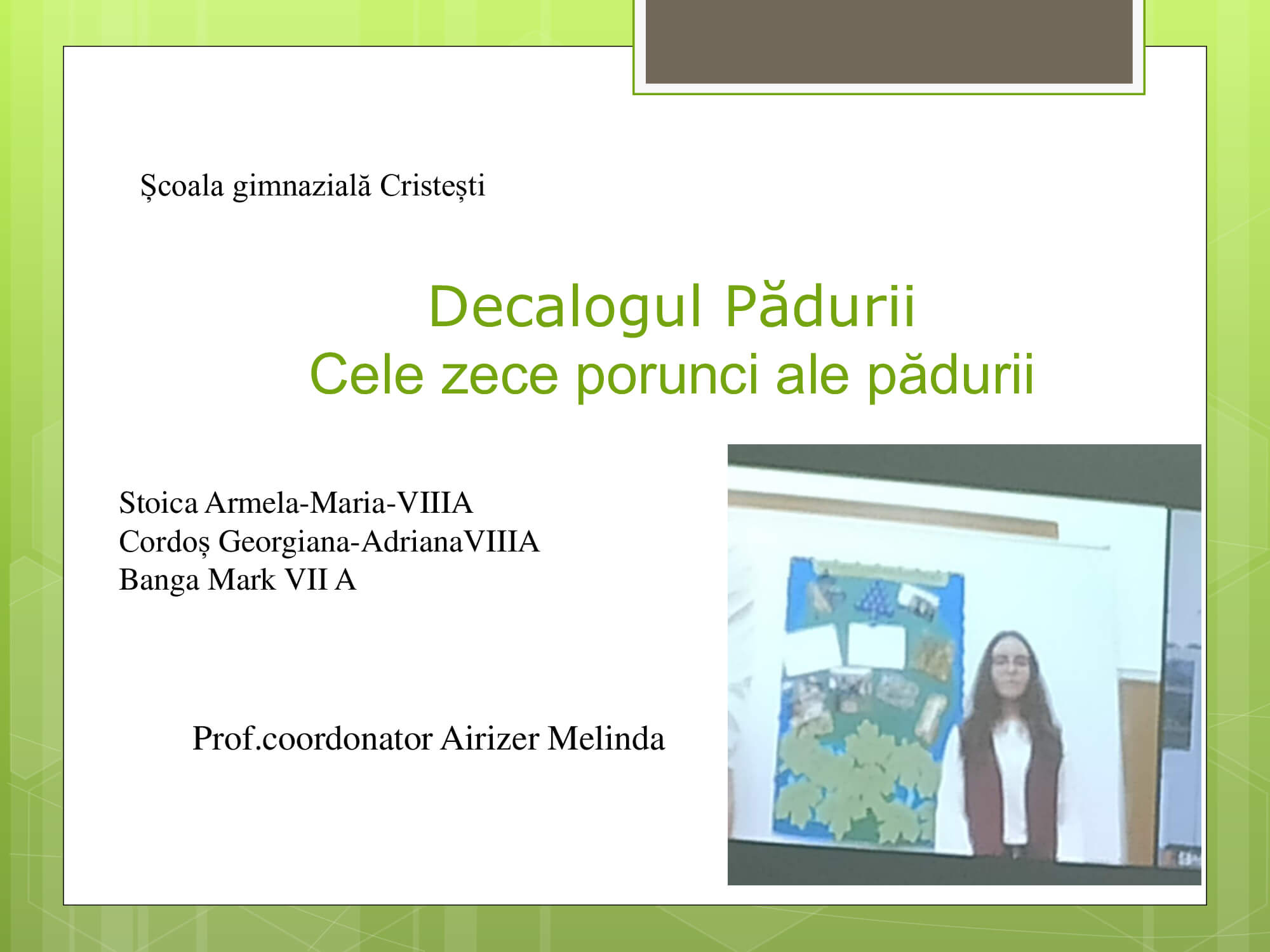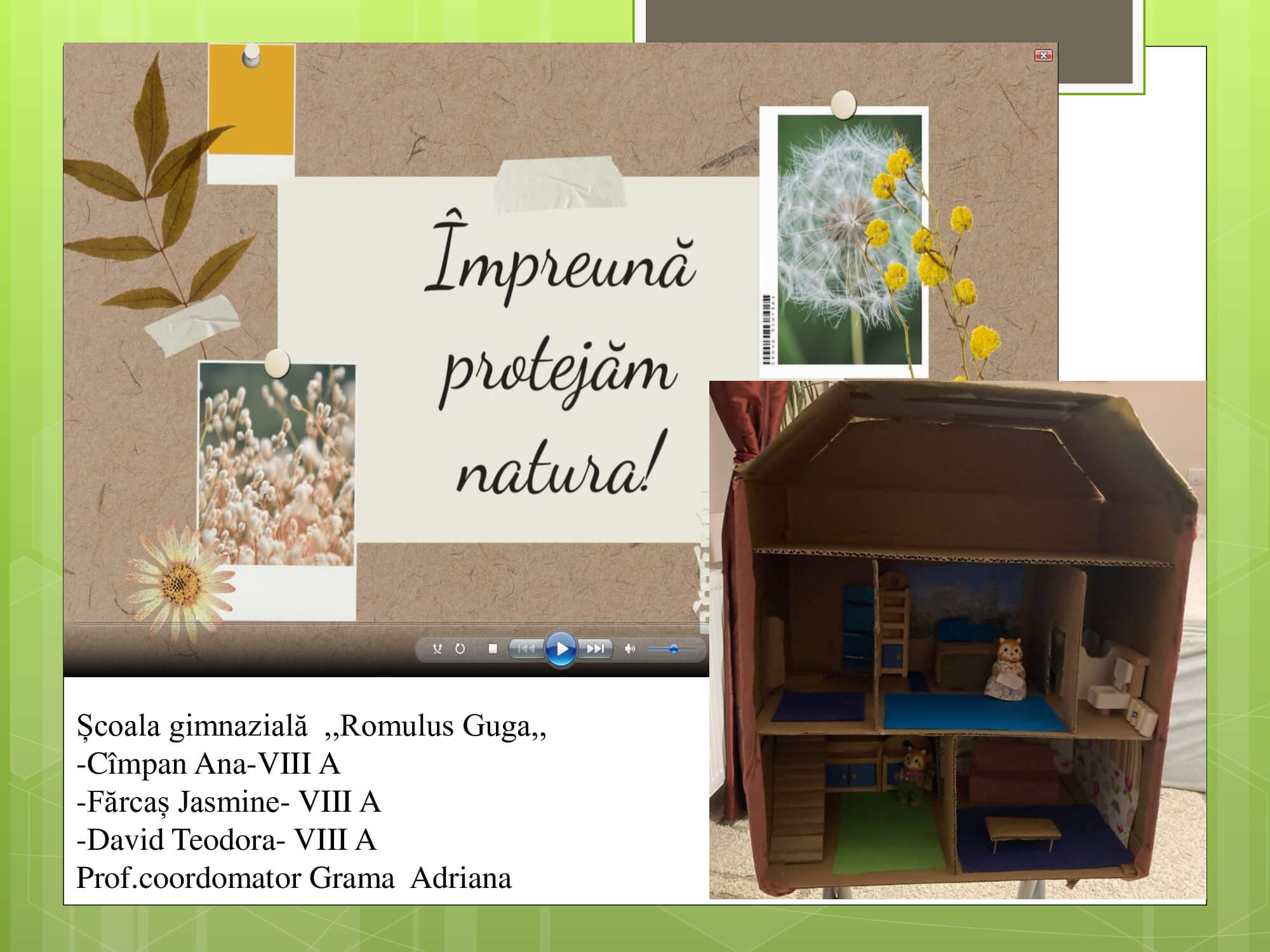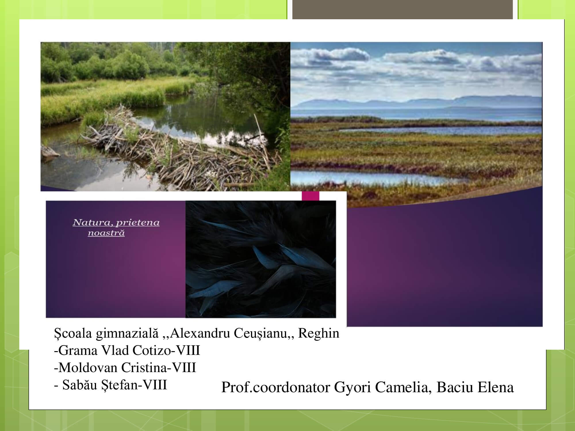 Concursul a constat în prezentarea unui proiect cu teme: „Natura prietena noastră-importanța protejării mediului înconjurător” care trebuie să surprindă următoarele aspecte: reciclare, reducere și reutilizare a deșeurilor, prevenirea poluării, reducerea poluării, influența deșeurilor asupra calității vieții animalelor, păsărilor, a omului, surse de energie „verde”, asigurarea unei vieți „curate” pentru toți.