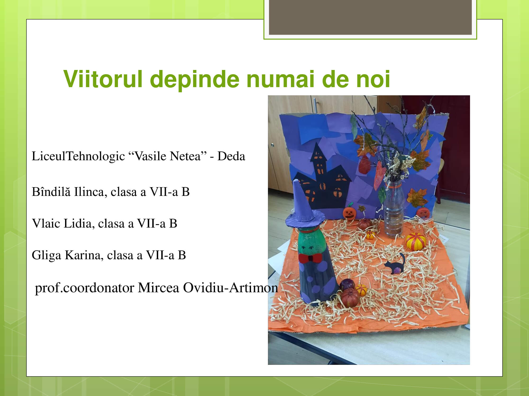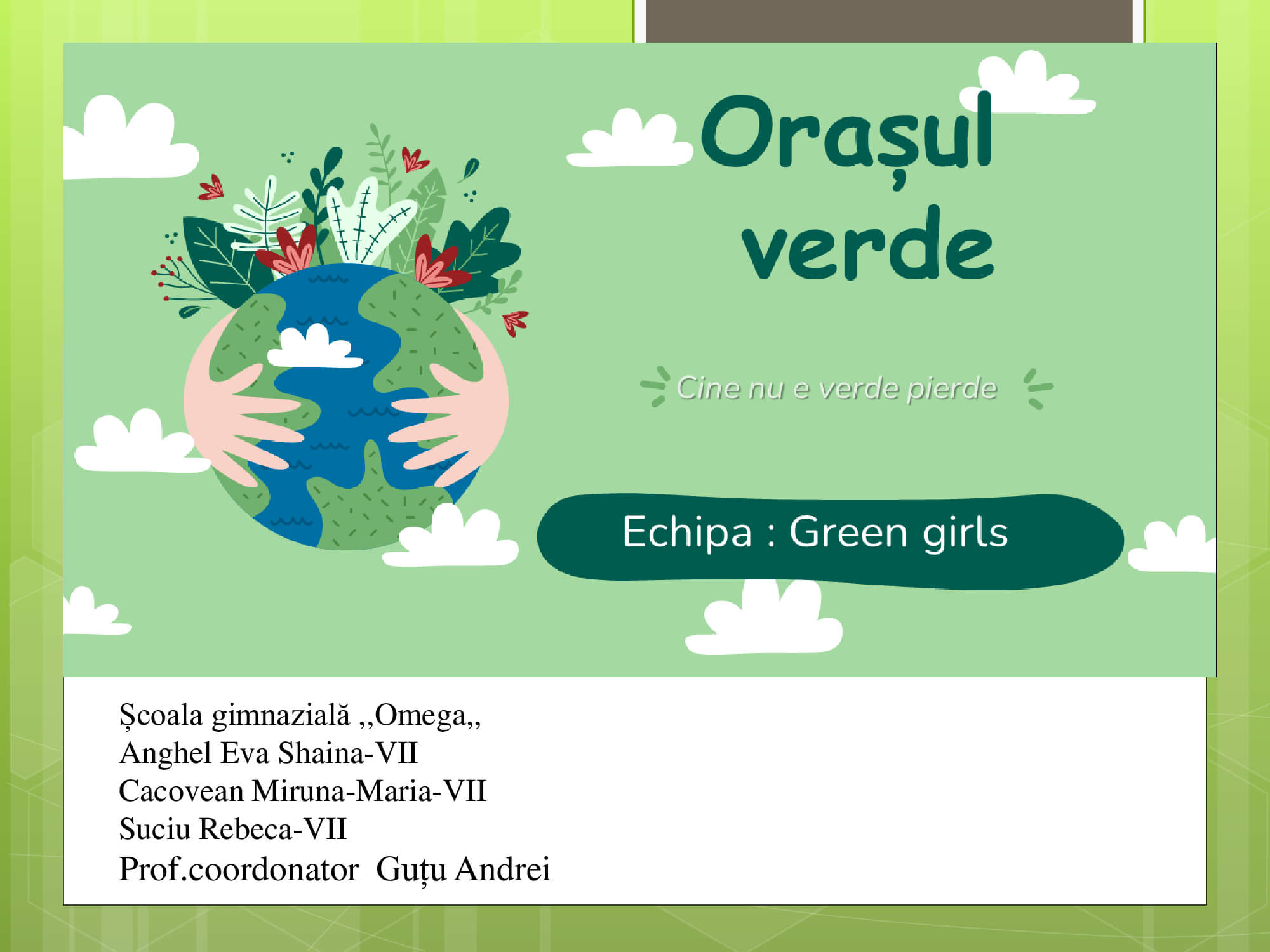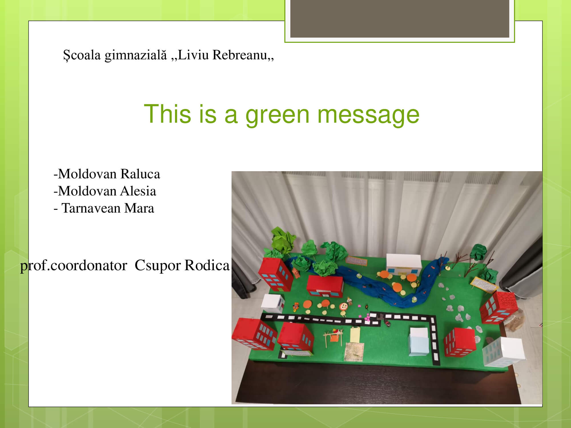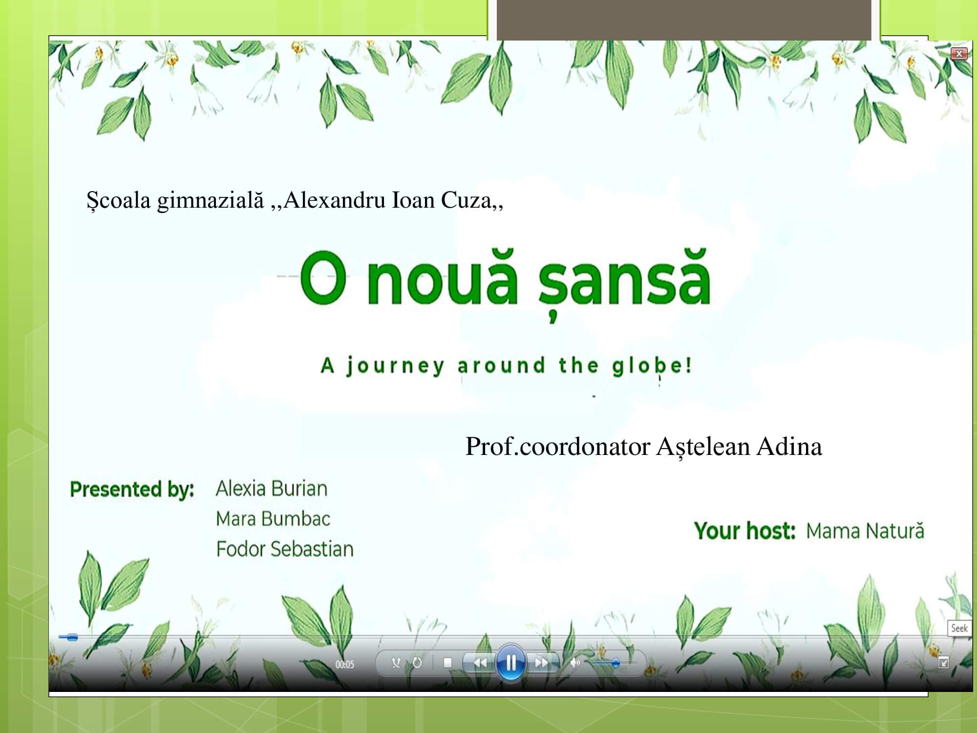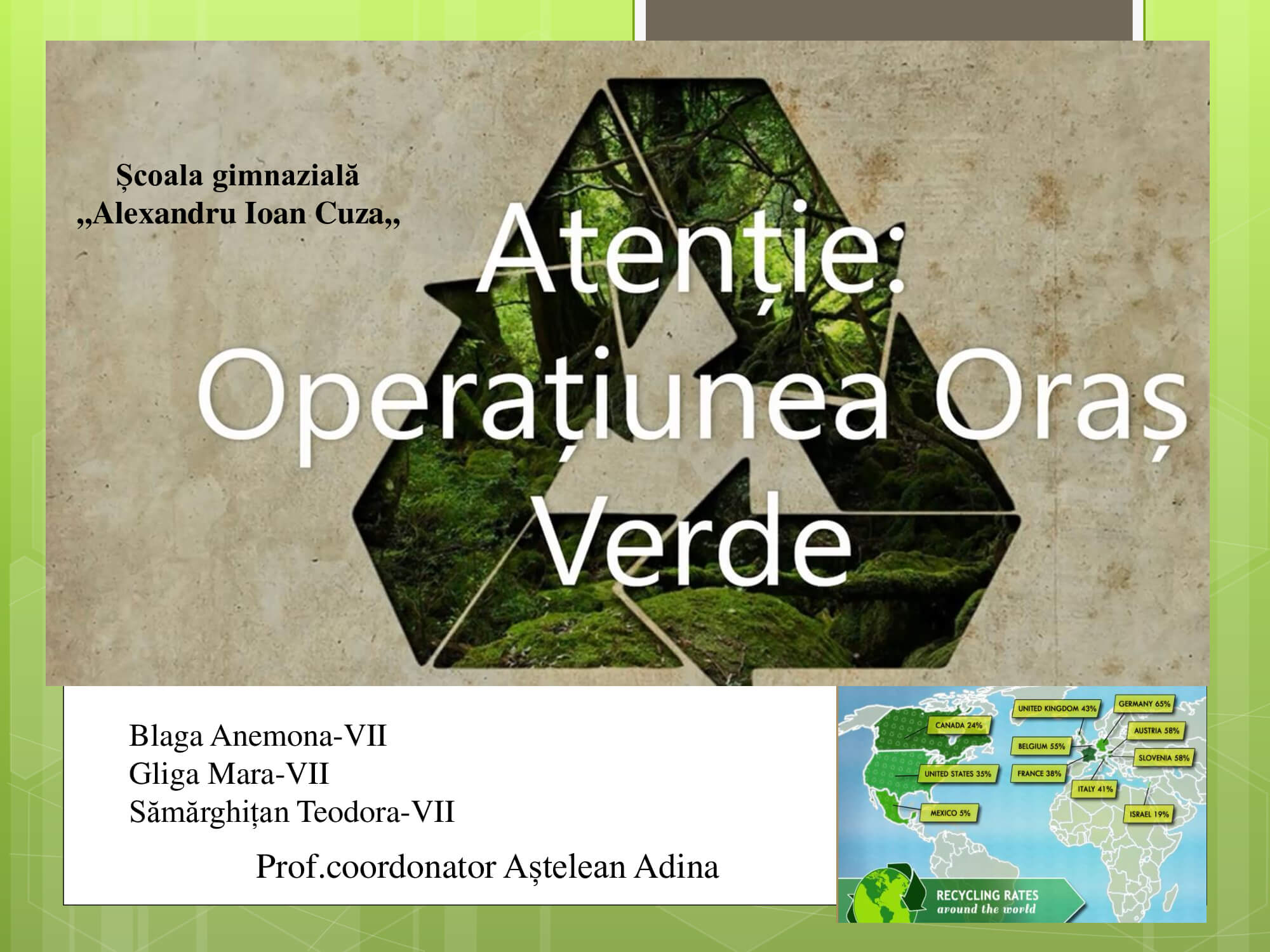 Concursul a constat în prezentarea unui proiect cu teme: „Natura prietena noastră-importanța protejării mediului înconjurător” care trebuie să surprindă următoarele aspecte: reciclare, reducere și reutilizare a deșeurilor, prevenirea poluării, reducerea poluării, influența deșeurilor asupra calității vieții animalelor, păsărilor, a omului, surse de energie „verde”, asigurarea unei vieți „curate” pentru toți.