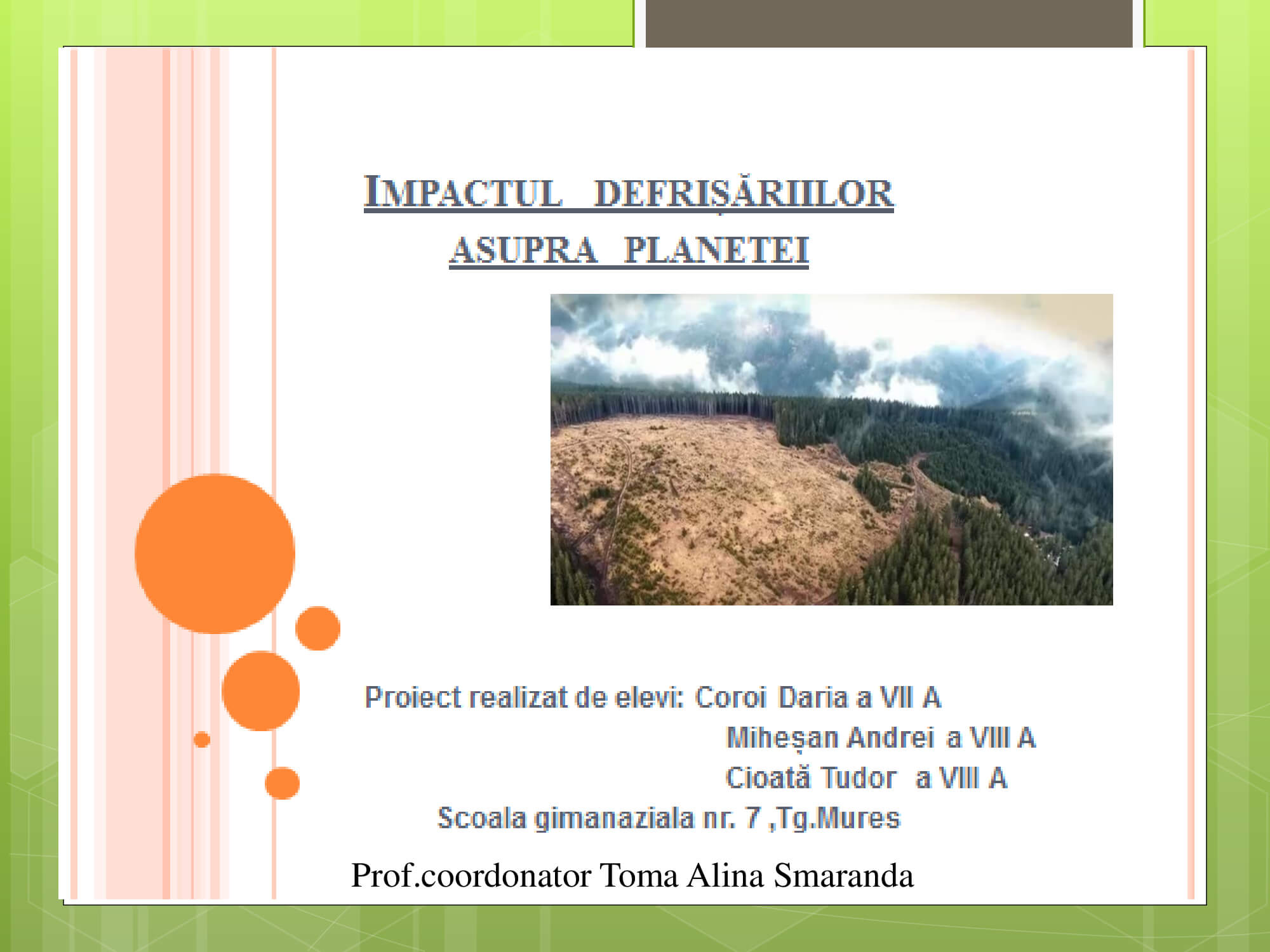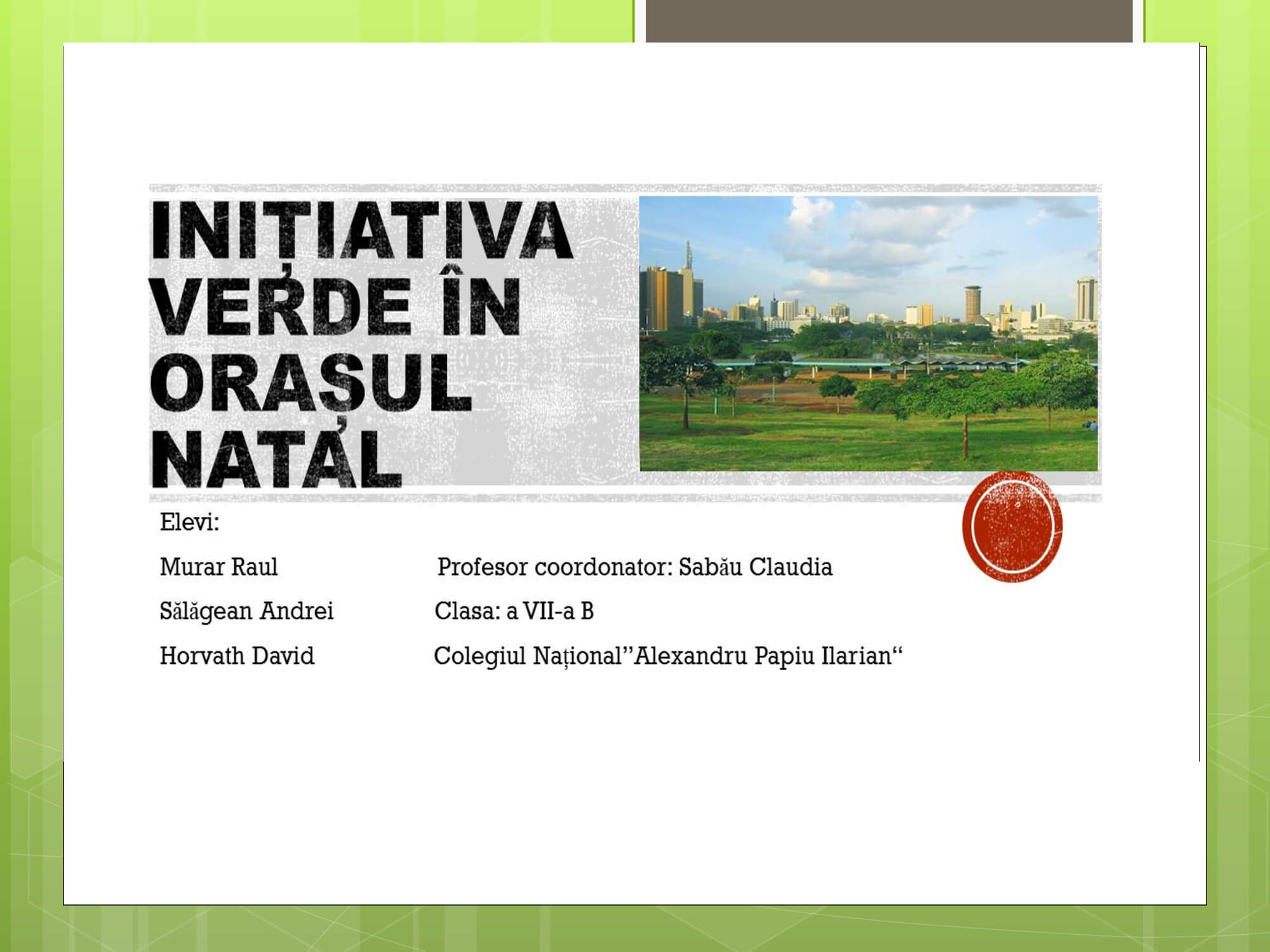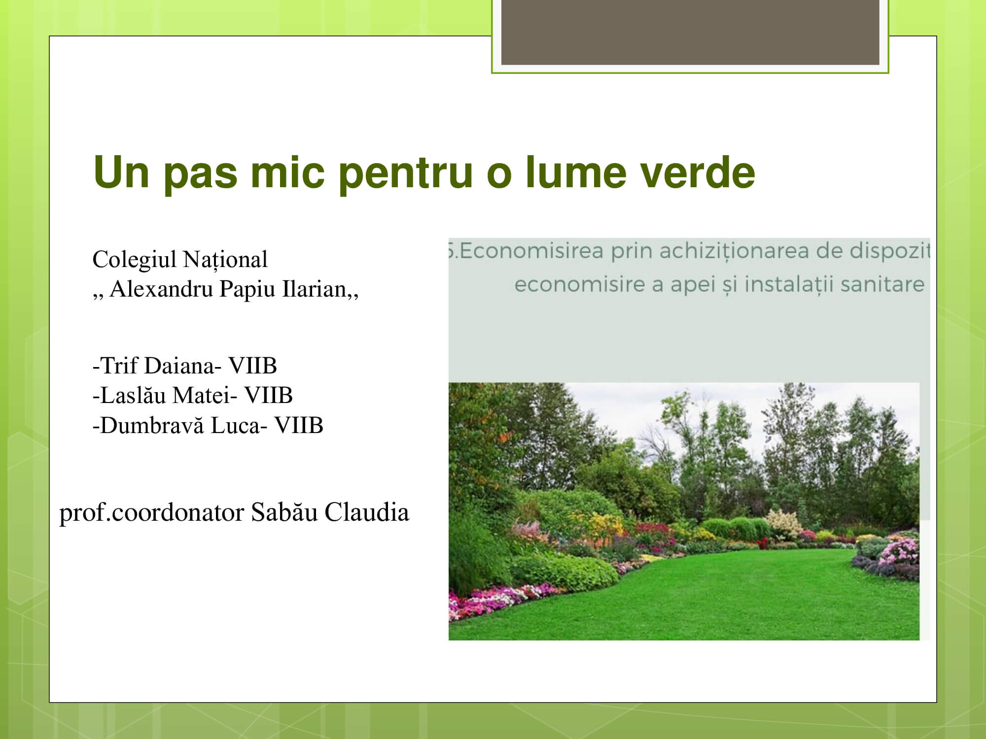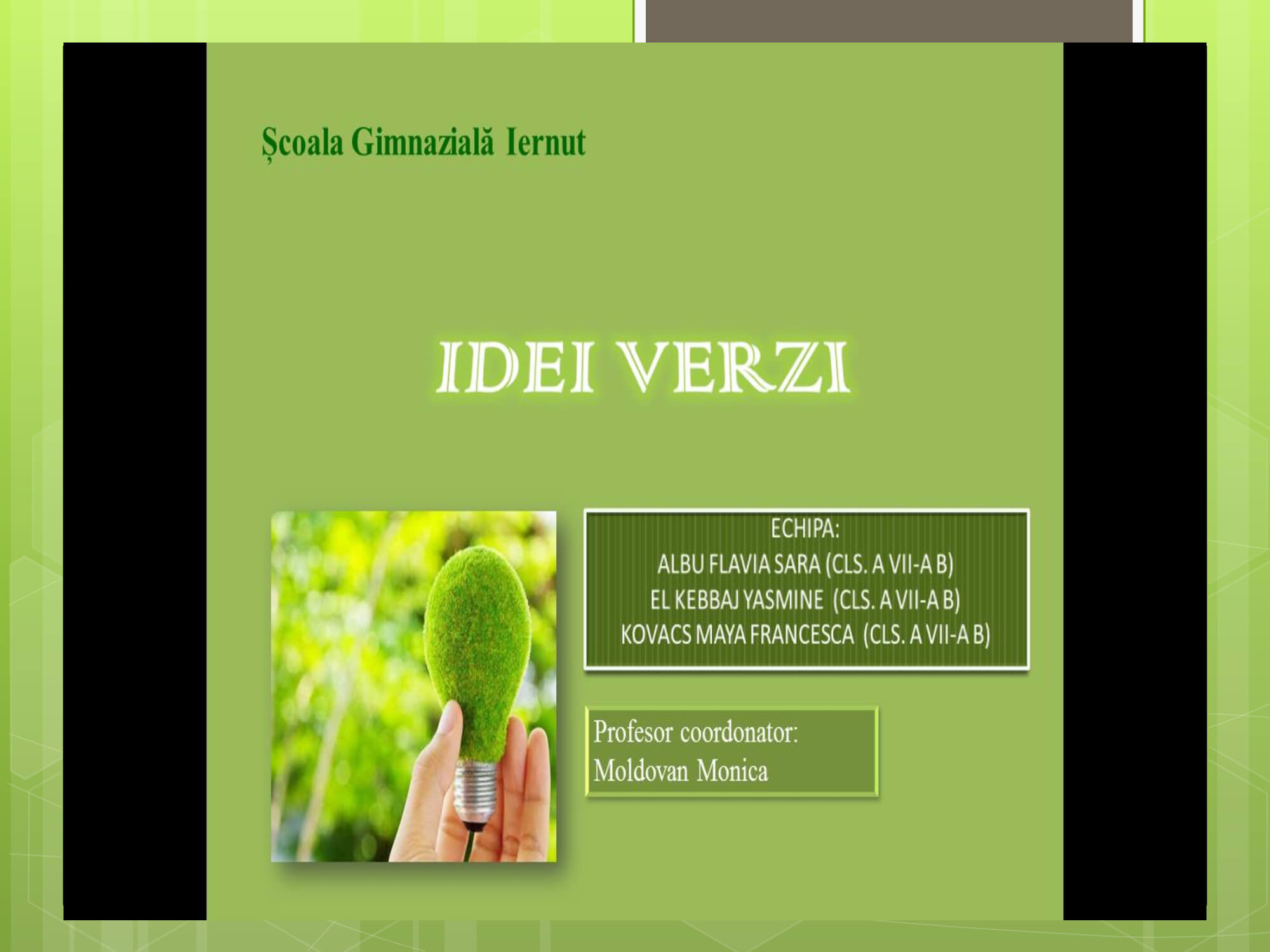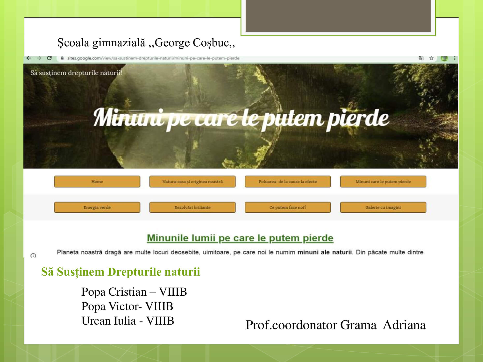 Concursul a constat în prezentarea unui proiect cu teme: „Natura prietena noastră-importanța protejării mediului înconjurător” care trebuie să surprindă următoarele aspecte: reciclare, reducere și reutilizare a deșeurilor, prevenirea poluării, reducerea poluării, influența deșeurilor asupra calității vieții animalelor, păsărilor, a omului, surse de energie „verde”, asigurarea unei vieți „curate” pentru toți.